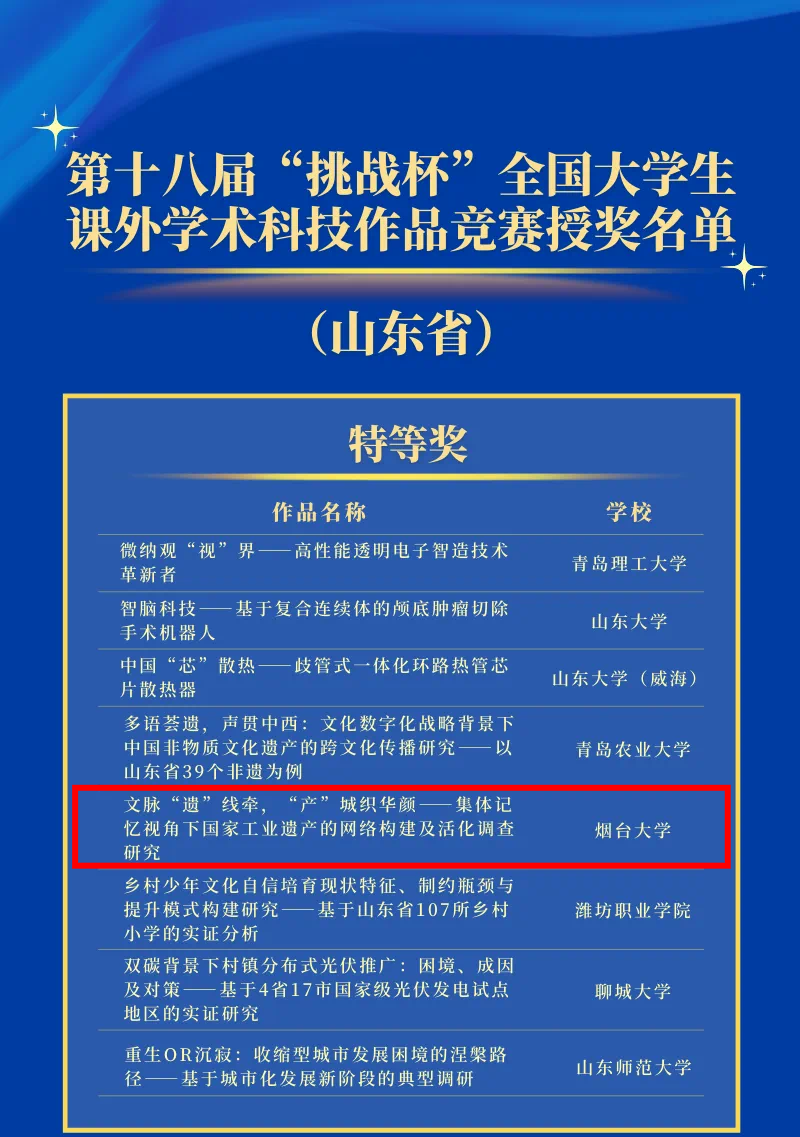 10月27日至31日,由共青团中央、中国科协、教育部、中国社会科学院、全国学联、贵州省政府共同主办的第十八届“挑战杯”全国大学生课外学术科技作品竞赛在贵州大学举办,来自344所内地高校的690件作品、9所港澳地区高校的23件作品入围主体赛终审决赛。其中,烟大学子获得主体赛特等奖1项、二等奖2项、三等奖3项,另有4项作品在“黑科技”展示活动中获奖,获奖数量位居全省高校前列,总成绩创学校参加历届“挑战杯”全国赛最佳。尤其值得一提的是,这是继烟大学子在第十七届“挑战杯”全国大学生课外学术科技作品竞赛取得特等奖重大突破后,再次荣获特等奖。
